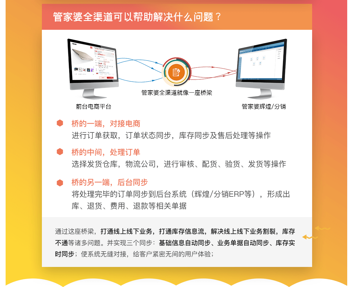 管家婆全渠道 是一個專業(yè)的電商業(yè)務(wù)管理系統(tǒng),既可以對接電商平臺,處理電商發(fā)貨業(yè)務(wù),又可以深度對接管家婆進(jìn)銷存軟件,使線上線下業(yè)務(wù)緊密結(jié)合,協(xié)同互補(bǔ),助力傳統(tǒng)企業(yè)開展電商全渠道業(yè)務(wù)。