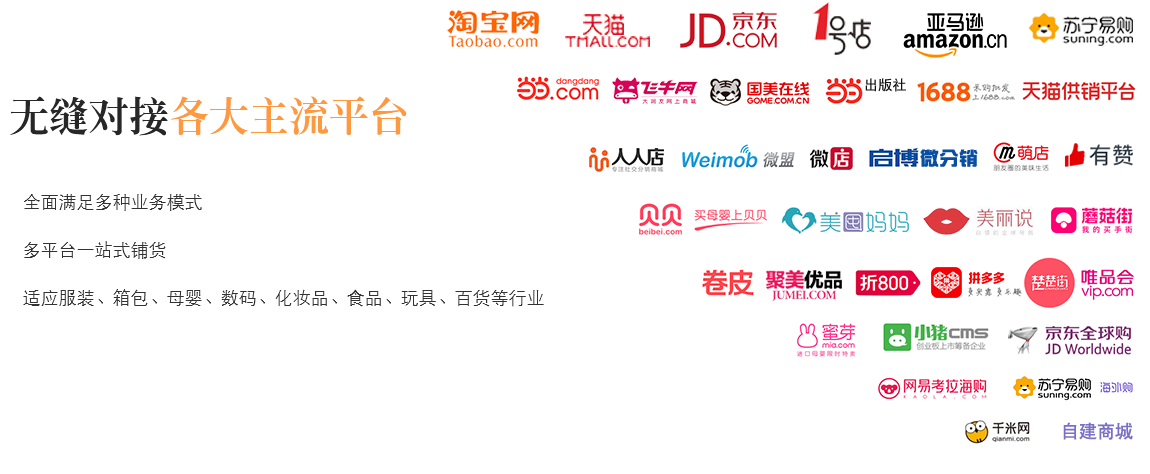 全渠道訂單自動化處理 全渠道訂單統一收訂 訂單智能監(jiān)控,防止漏單、錯單 電子面單全面對接,每小時3000訂單輕松打 多平臺、多店鋪庫存統一管理 多平臺庫存自動同步,線上線下庫存同步 庫存數據自動更新,避免超賣 智能補貨,及時補貨備貨 各類賬目清晰明了 與供應商、分銷商往來對賬清晰準確 物流、快遞費用自動結算 各平臺運營數據輕松掌握,獨立核算